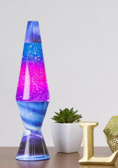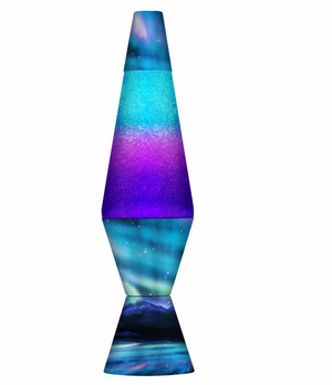 LAVA Lamps have continued to captivate for over 50 years. It has one of the most recognized, trademarked shapes of all time. LAVA glitter Lamps produce a soft warm light and mesmerizing visuals of gently swirling, silver glitter sparkling in the clear liquid. Glitter lamps have an instant start and require no warm-up time. Silver glitter / clear liquid / Northern Lights decal base & cap. Instant start up action! Provides relaxing, soft light. Aluminum base. 25 watt light bulb included. Plugs into a power outlet.