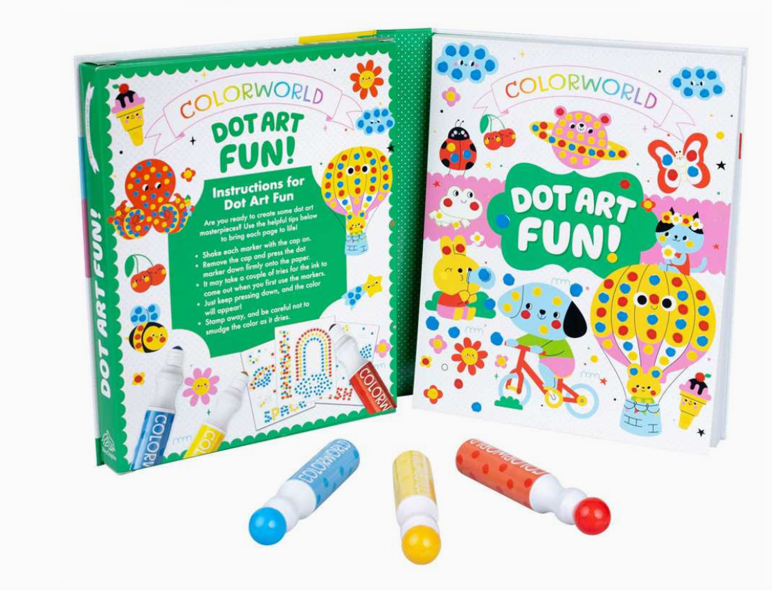 Keep your creative kids busy with this simple and fun dot art coloring kit that comes with 3 jumbo dot markers, 30+ stickers, and tons of dot art fun!