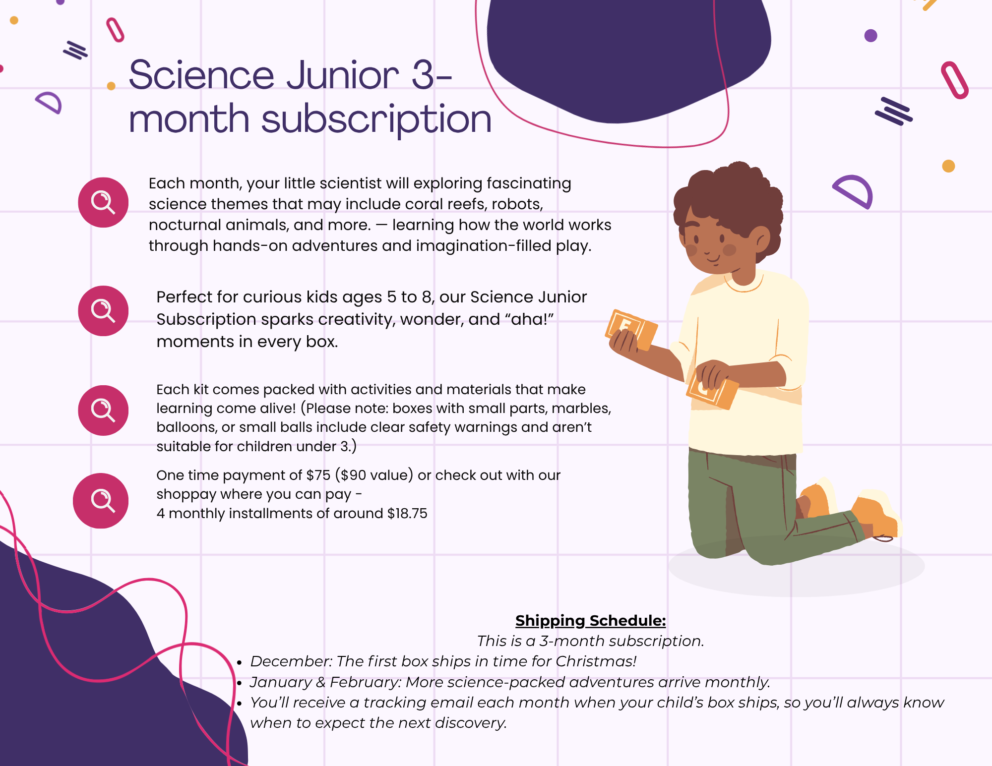 Science Junior 3-Month SubscriptionGet ready for big discoveries and even bigger fun! Each month, your little scientist will exp...
