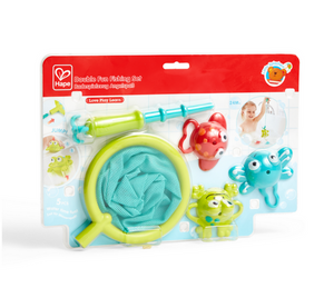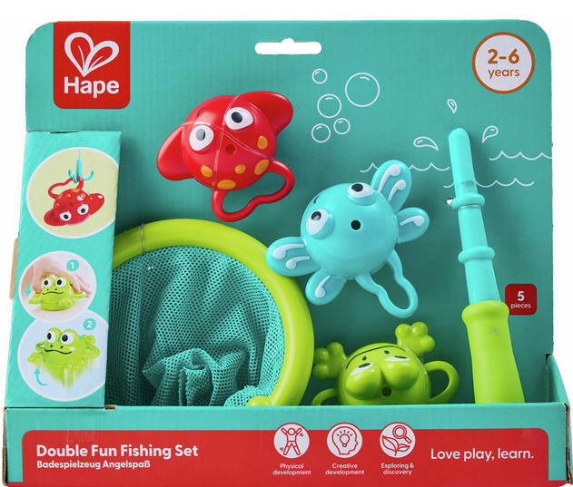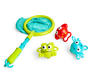 Double fun fishing set! Push down on these lovely creatures and they jump up! Use the fishing pole to catch each one and stow it in your net.