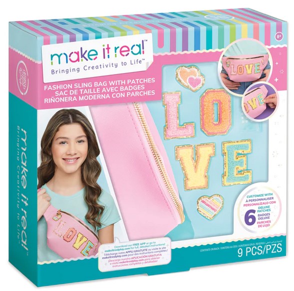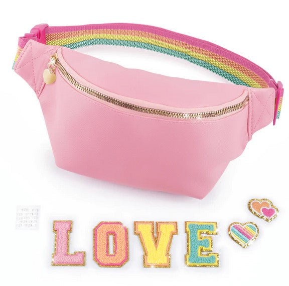 Uber trendy fashion sling bag silhouette with sparkly terry fabric and embroidered patches that spell out LOVE waiting to be add...