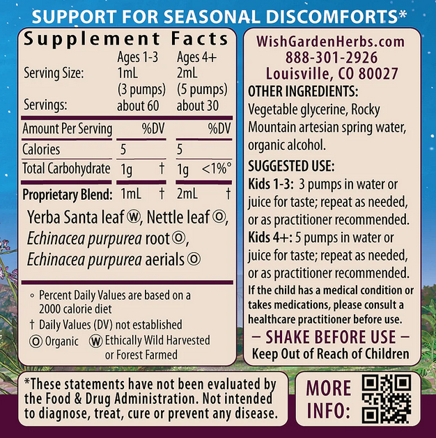 Kids 1-3: Take 3 pumps in water or juice for taste; repeat as needed or as practitioner recommended. Kids 4+: Take 5 pumps in water or juice for taste; repeat as needed or as practitioner recommended.