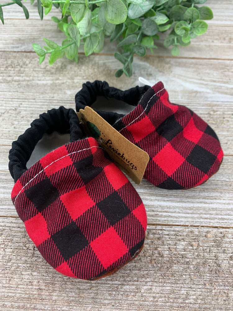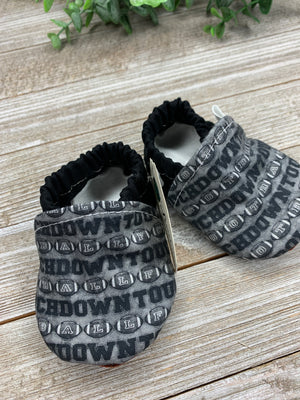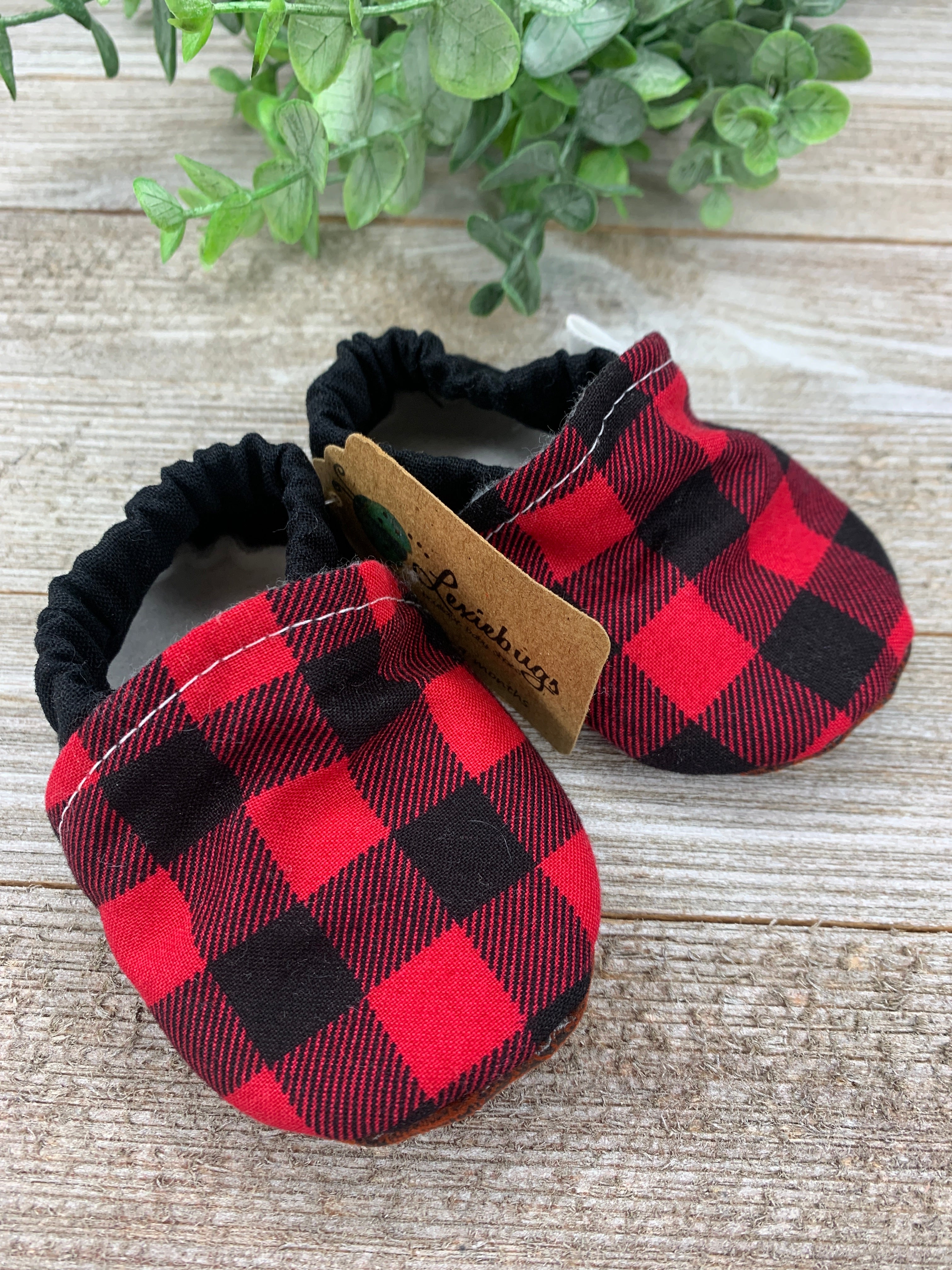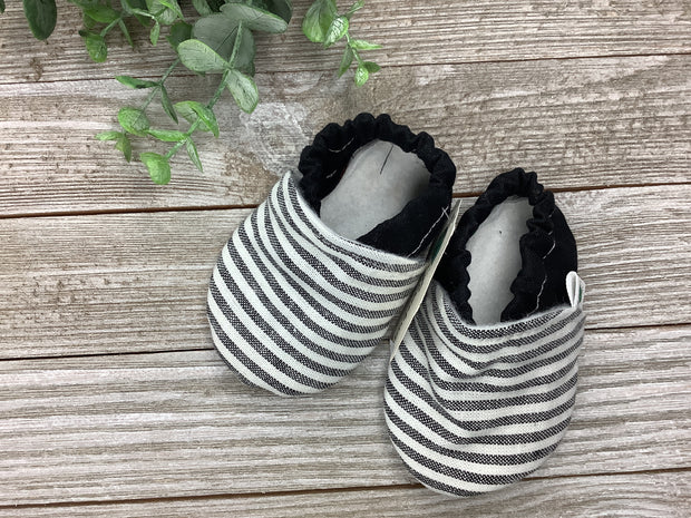 These shoes are made from a fashionable printed fabric for the outside and lined with a soft winter white fleece. The sole is made from a faux leather, perfect for no sliding/skidding. The shoe is made with elastic to keep the shoe in place on the baby's foot. Sizes 9-12 months, 12-18 months and 18-24 months get a strip of leather across the toes for extra protection. This makes the shoe more durable and last longer.