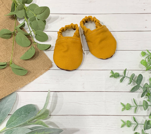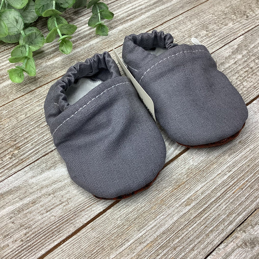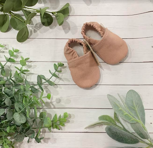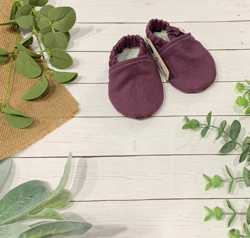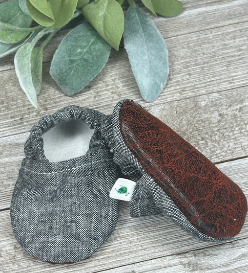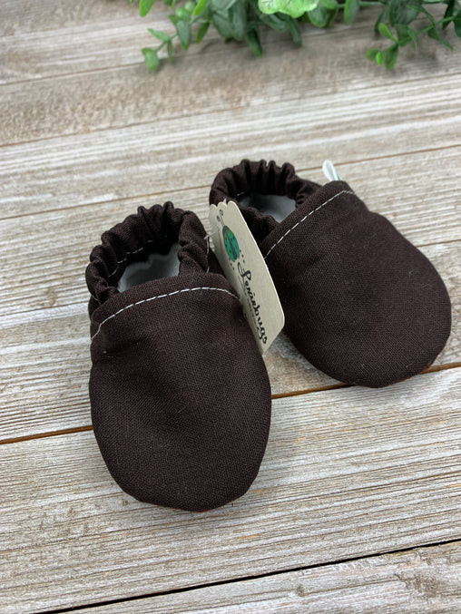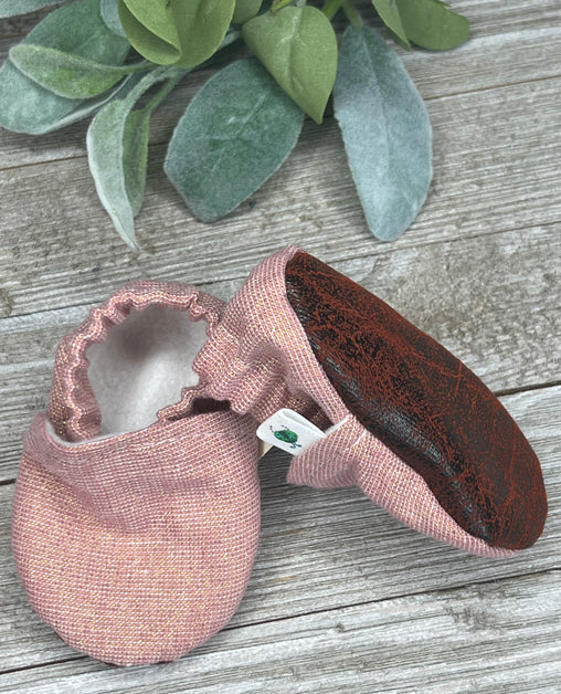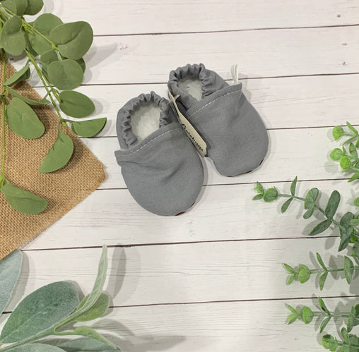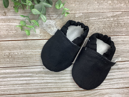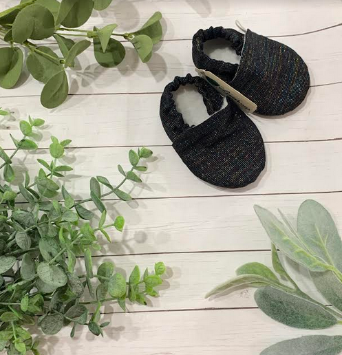 Lexiebugs are handmade baby shoes with a fashionable fabric for the outside and lined with a soft winter white fleece. The sole is made from a brown faux leather-perfect for no sliding or skidding. The shoes are made with elastic to ensure they stay on your baby's feet. The larger shoes get a strip of the leather across the toes for extra protection. This makes the shoe more durable and last longer. All Lexiebug products are handmade in South Dakota and are machine washable.
