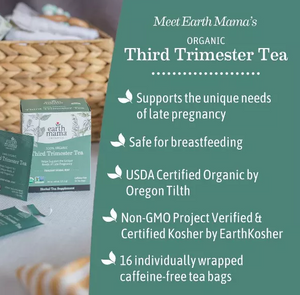 You. Are. Almost. There! Yay! So we made this for you: Organic Third Trimester Tea is a hearty blend of stinging nettles, chamomile, rosehips, oatstraw and red raspberry leaf, traditionally used to nurture your third trimester self and to prepare for labor. It's a time-honored blend for the occasional leg cramp that can…um…CRAMP your style in the third trimester.
