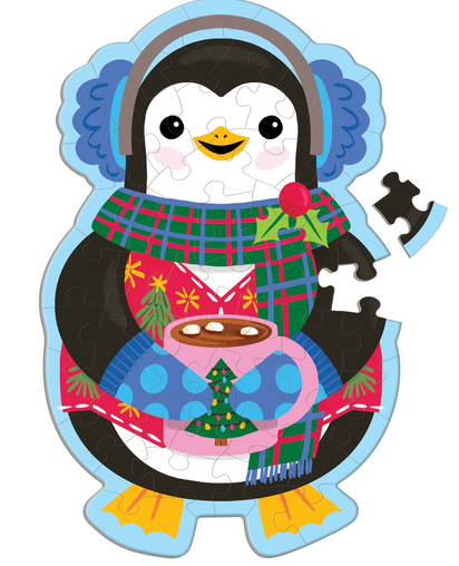 The Hot Cocoa Penguin 48 Piece Scratch and Sniff Shaped Mini Puzzle from Mudpuppy features a colorful image of a festive penguin...