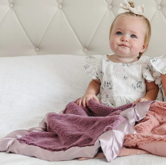 The lovable texture of our signature buttery lush fabric with a touch of silky satin on the border. Made in a light lavender color, babies love the combination of the two textures on this blanket.