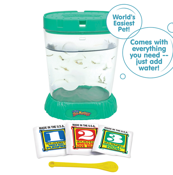 • The original world’s easiest to care for, no-mess pet • Dive into the fun with an aquarium that includes a molded seascape and built-in magnifiers for an up-close view of your Sea-Monkeys! • Features a ventilated lid that keeps your pets happy and healthy • Includes water purifier, instant live eggs, Sea-Monkeys food, feeding spoon, and instructions • 3 assorted colors (blue, teal, purple); 5.7” tall
