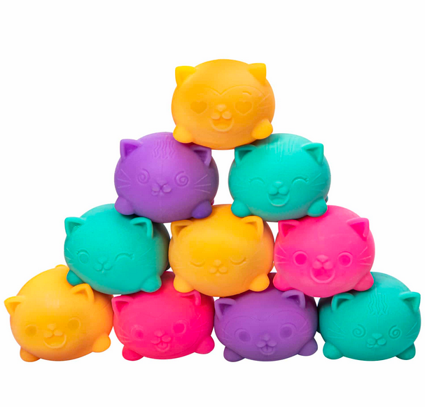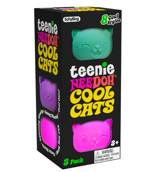 The groovy gratifying NeeDoh® is now available as a teenie cool cat! Squeeze it, pull it, smush it. However you choose to manipulate this fun dough-filled animal it always returns to its original shape. You will experience an irresistible satisfaction that sooths your soul and the cats have 8 fun facial expressions! The mini size fits nicely in your hands! Kids and adults love Teenie NeeDoh Cool Cats as a gift, at the office, in school, or for any time you want take a quick chill moment. Available in four assorted bright colors that come in packs of three.